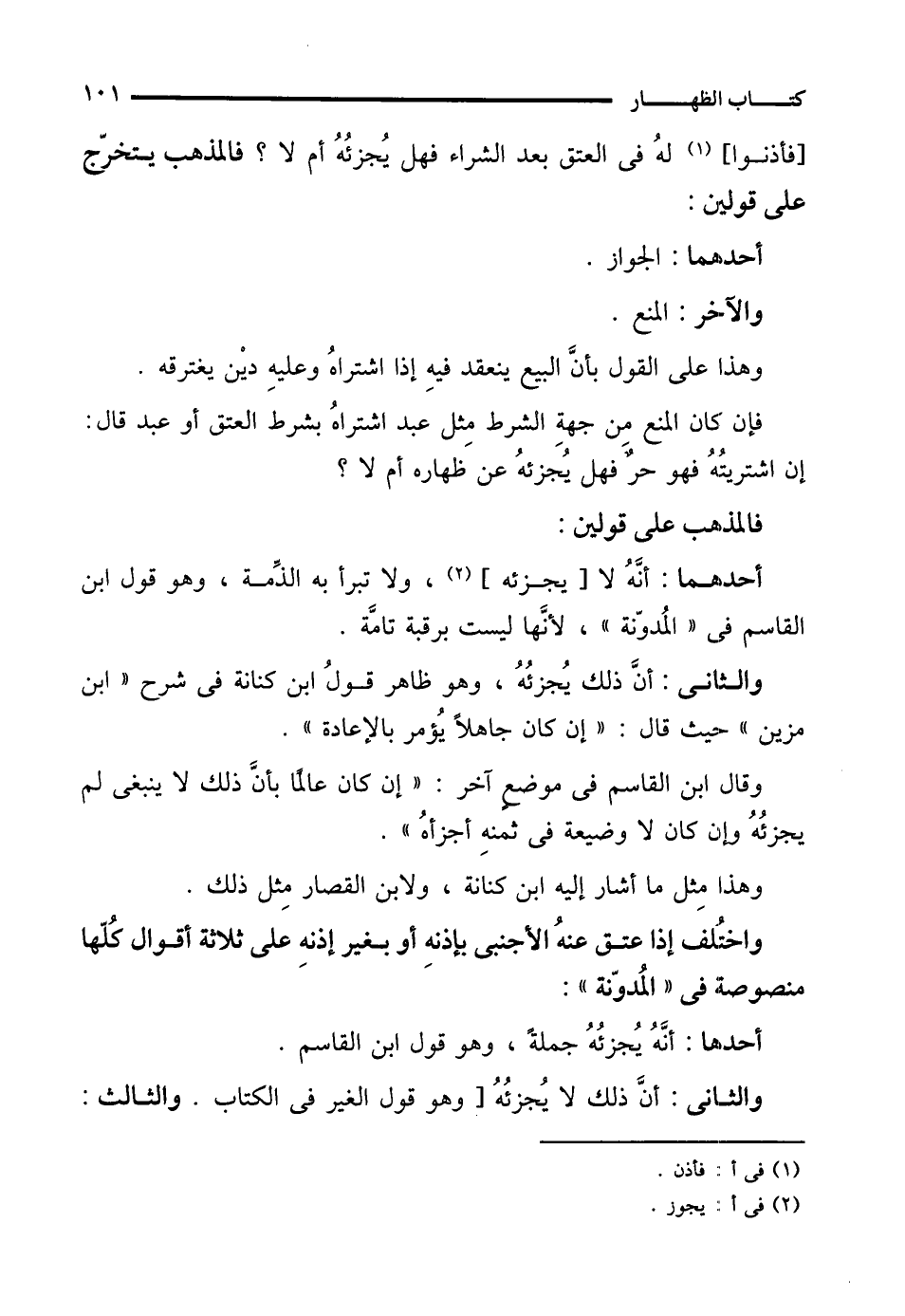 والثانى: أنَّ ذلك لا يُجزئُهُ [وهو قول الغير في الكتاب. والثالث: