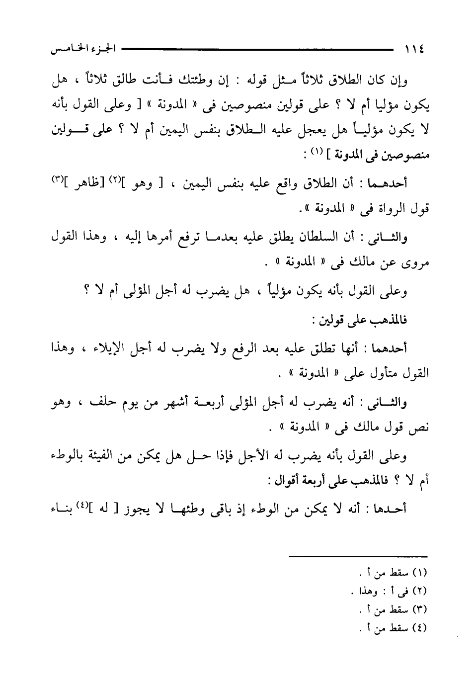 وإن كان الطلاق ثلاثًا مثل قوله: إن وطئتك فأنت طالق ثلاثًا، هل يكون مؤليا أم لا؟ على قولين منصوصين في "المدونة" [وعلى القول بأنه لا يكون مؤليًا هل يعجل عليه الطلاق بنفس اليمين أم لا؟ على قولين منصوصين في المدونة] (¬1):