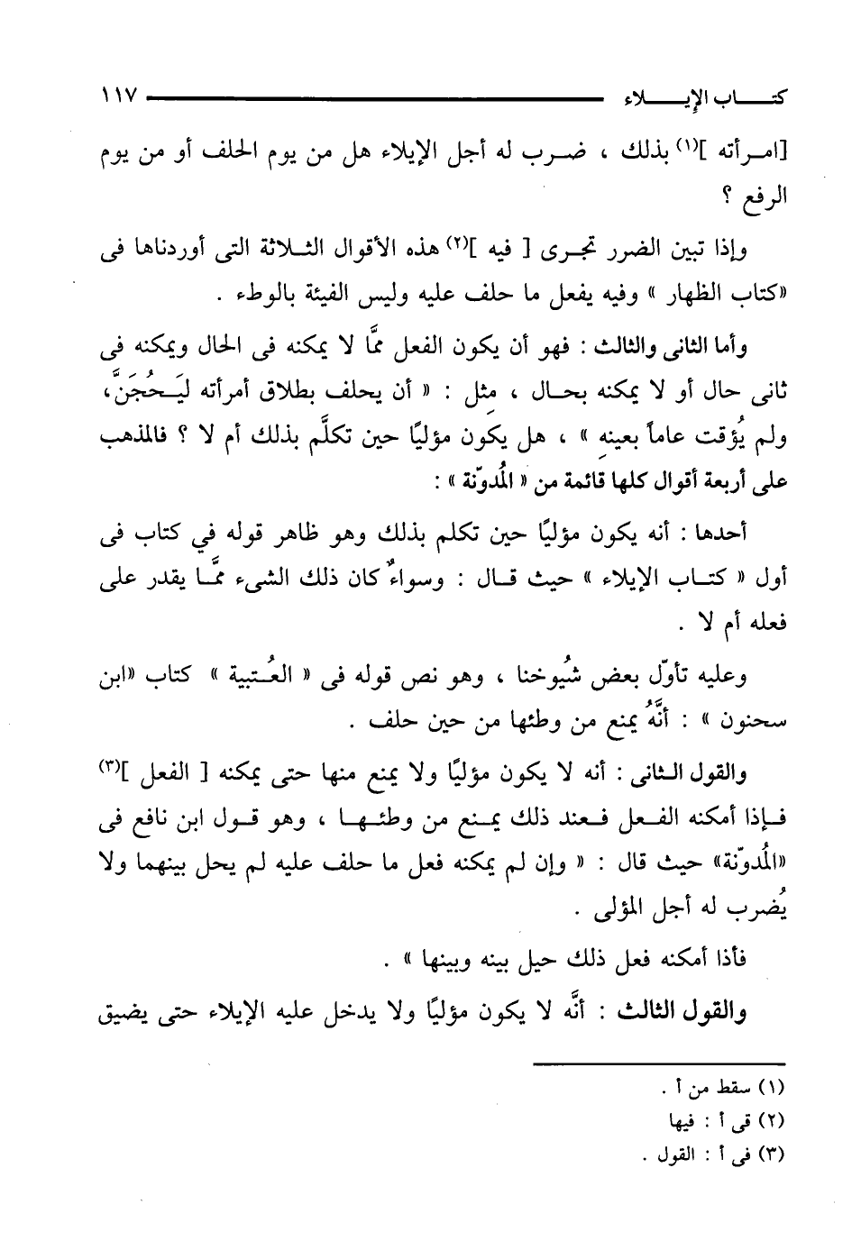 وأما الثاني والثالث: فهو أن يكون الفعل ممَّا لا يمكنه في الحال ويمكنه في ثانى حال أو لا يمكنه بحال، مثل: "أن يحلف بطلاق امرأته ليَحُجَنَّ، ولم يُؤقت عامًا بعينهِ"، هل يكَون مؤليًا حين تكلَّم بذلك أم لا؟ فالمذهب على أربعة أقوال كلها قائمة من "المُدوّنة":