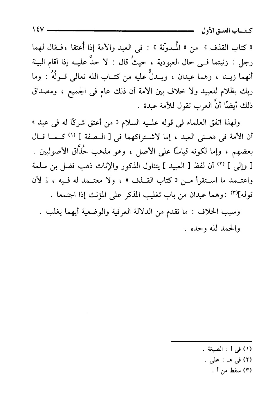"كتاب القذف" من "المُدوّنة": في العبد والأمة إذا أُعتقا، فقال لهما رجل: زنيتما في حال العبودية، حيثُ قال: لا حدَّ عليه إذا أقام البينة أنهما زنيا، وهما عبدان، ويدلُّ عليه من كتاب الله تعالى قولهُ: وما ربك بظلام للعبيد ولا خلاف بين الأمة أن ذلك عام في الجميع، ومصداق ذلك أيضًا أن العرب تقول للأمة عبدة.
