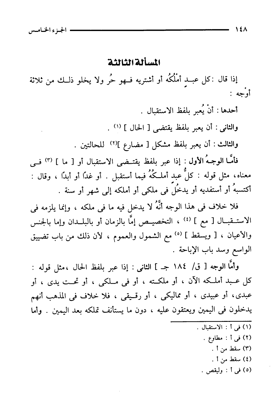 فأمَّا الوجهُ الأول: إذا عبر بلفظ يقتضى الاستقبال أو [ما] (¬3) في معناه، مثل قوله: كلُّ عبدٍ أملكُهُ فيما أستقبل. أو غدًا أو أبدًا، وقال: أكتسبهُ أو أستفديه أو يدخُل في ملكى أو أملكه إلى شهر أو سنة.