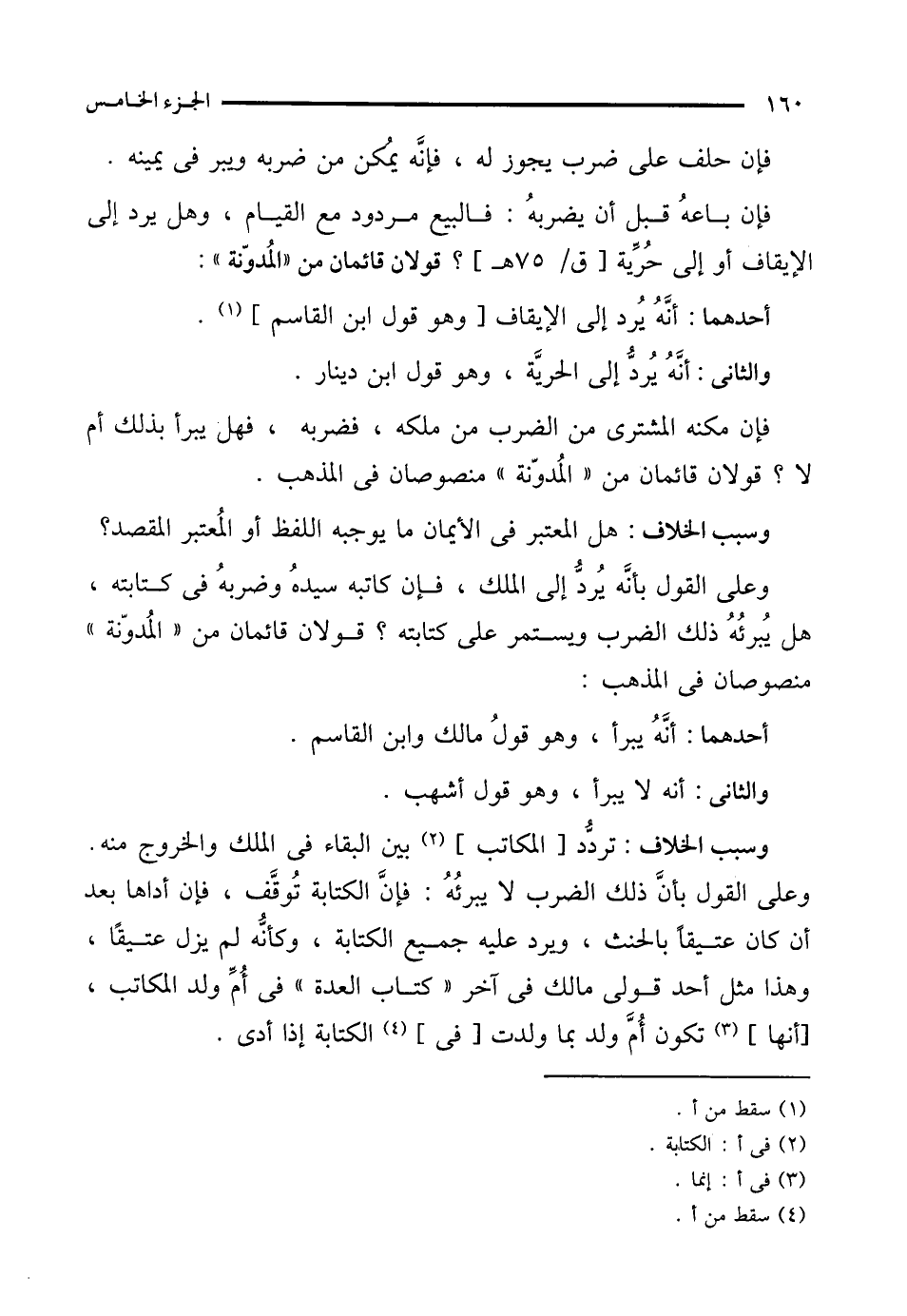وسبب الخلاف: تردُّد [المكاتب] (¬2) بين البقاء في الملك والخروج منه. وعلى القول بأنَّ ذلك الضرب لا يبرئُهُ: فإنَّ الكتابة تُوقَّف، فإن أداها بعد أن كان عتيقًا بالحنث، ويرد عليه جميع الكتابة، وكأنُّه لم يزل عتيقًا، وهذا مثل أحد قولى مالك في آخر "كتاب العدة" في أُمِّ ولد المكاتب، [أنها] (¬3) تكون أُمَّ ولد بما ولدت [في] (¬4) الكتابة إذا أدى.
