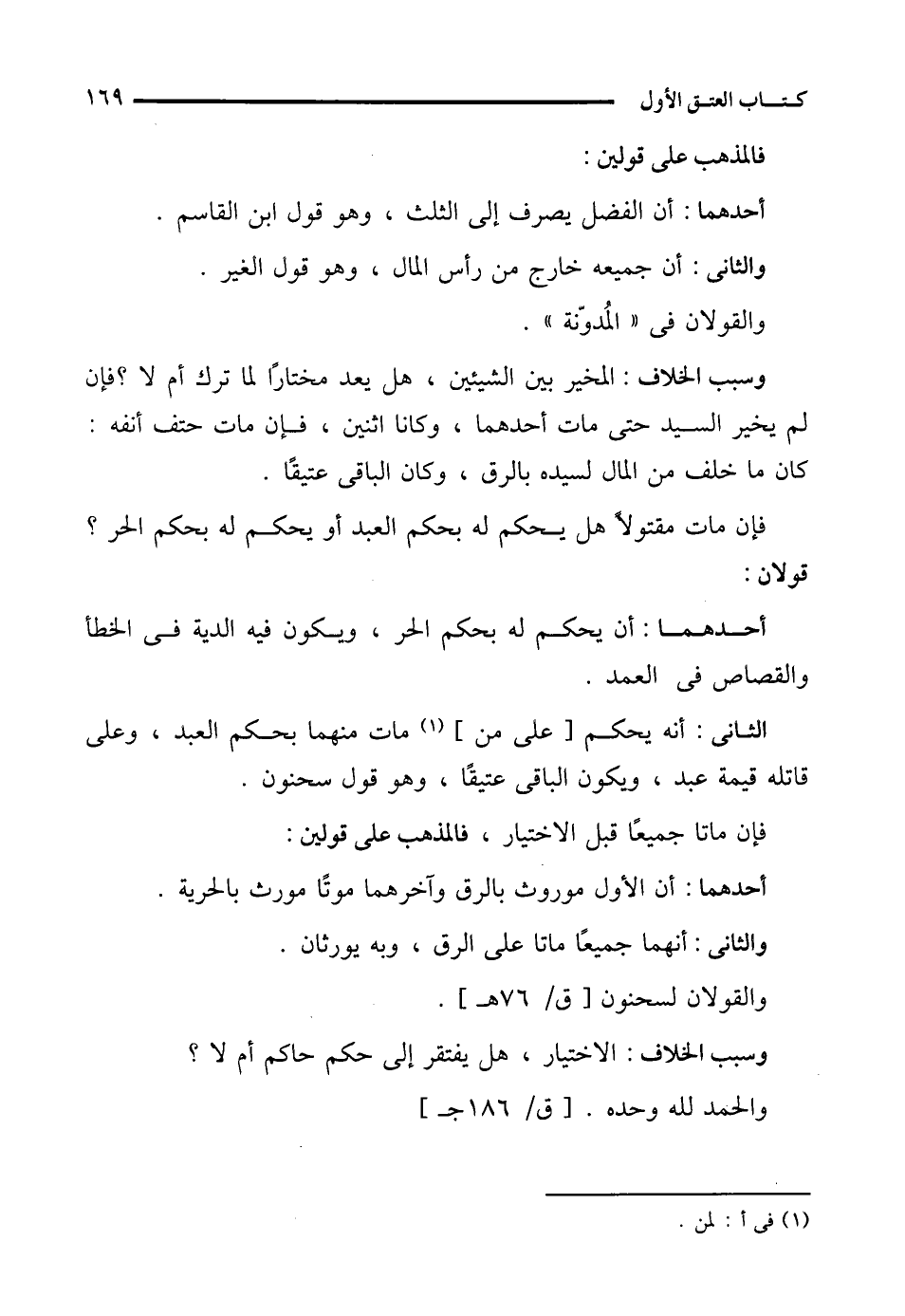 وسبب الخلاف: المخير بين الشيئين، هل يعد مختارًا لما ترك أم لا؟ فإن لم يخير السيد حتى مات أحدهما، وكانا اثنين، فإن مات حتف أنفه: كان ما خلف من المال لسيده بالرق، وكان الباقي عتيقًا.