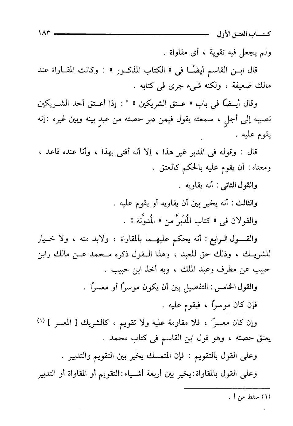 والقول الرابع: أنه يحكم عليهما بالمقاواة، ولابد منه، ولا خيار للشريك، وذلك حق للعبد، وهذا القول ذكره محمَّد عن مالك وابن حبيب عن مطرف وعبد الملك، وبه أخذ ابن حبيب.