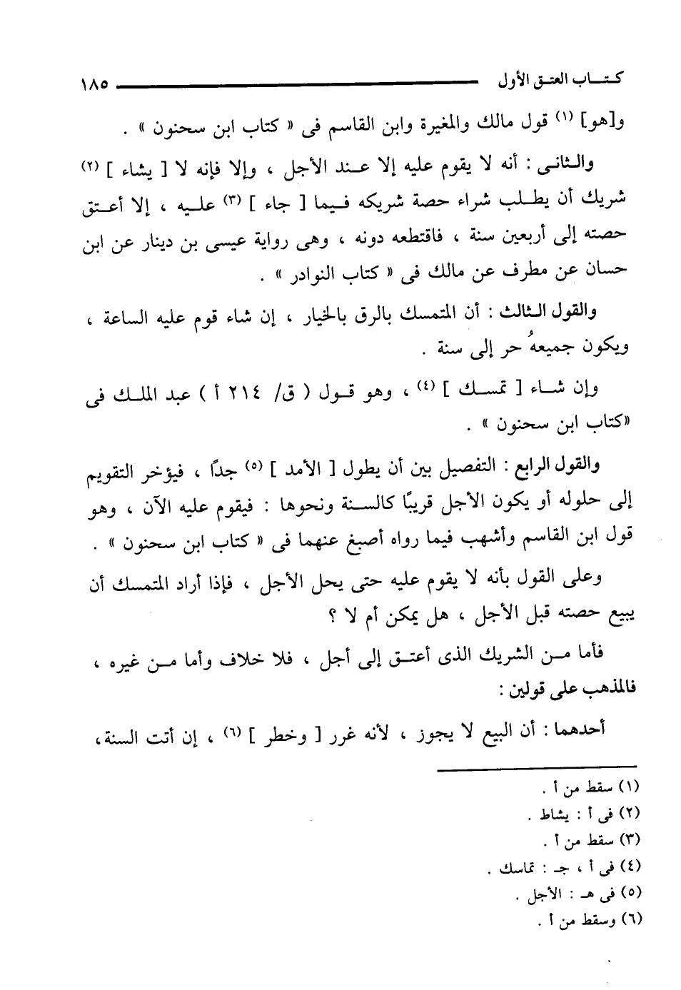 والقول الرابع: التفصيل بين أن يطول [الأمد] (¬5) جدًا، فيؤخر التقويم إلى حلوله أو يكون الأجل قريبًا كالسنة ونحوها: فيقوم عليه الآن، وهو قول ابن القاسم وأشهب فيما رواه أصبغ عنهما في "كتاب ابن سحنون".