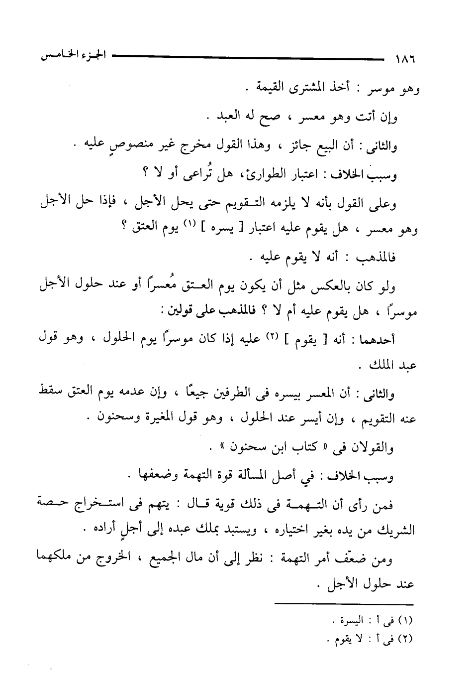 والثانى: أن المعسر بيسره في الطرفين جميعًا، وإن عدمه يوم العتق سقط عنه التقويم، وإن أيسر عند الحلول، وهو قول المغيرة وسحنون.