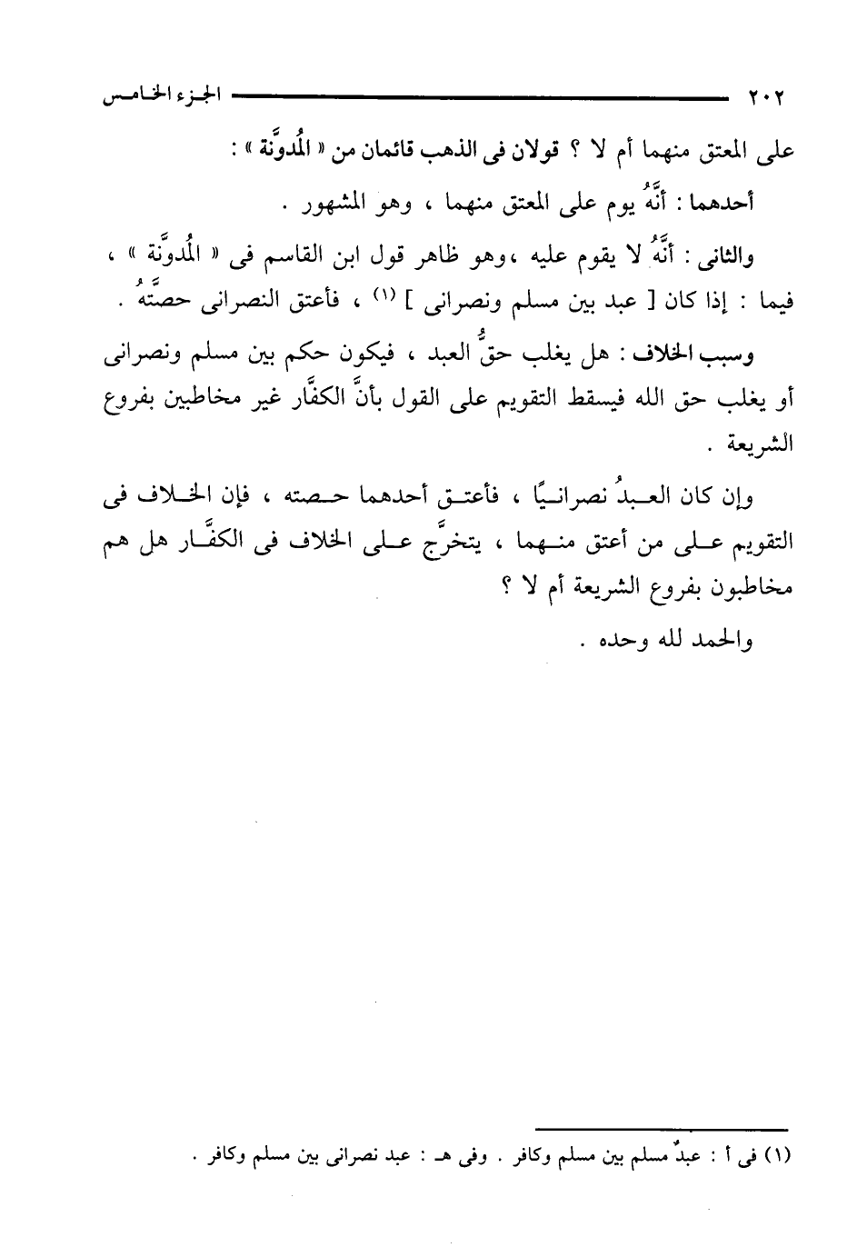 وسبب الخلاف: هل يغلب حقُّ العبد، فيكون حكم بين مسلم ونصرانى أو يغلب حق الله فيسقط التقويم على القول بأنَّ الكفَّار غير مخاطبين بفروع الشريعة.
