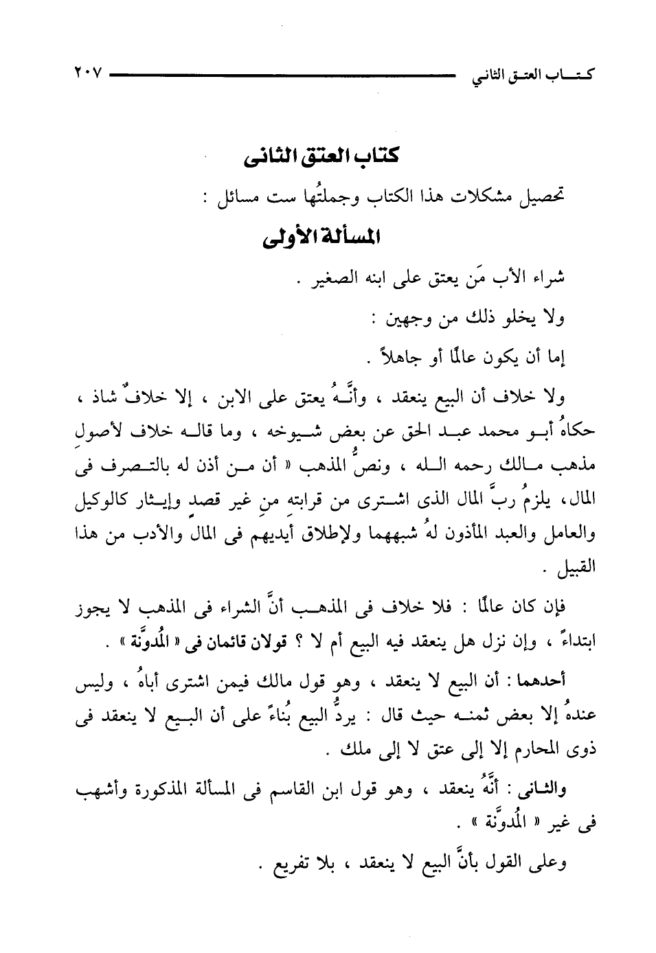 ولا خلاف أن البيع ينعقد، وأنَّهُ يعتق على الابن، إلا خلافٌ شاذ، حكاهُ أبو محمَّد عبد الحق عن بعض شيوخه، وما قاله خلاف لأصولِ مذهب مالك رحمه الله، ونصُّ المذهب "أن من أذن له بالتصرف في المال، يلزمُ ربَّ المال الذي اشترى من قرابته من غير قصد وإيثار كالوكيل والعامل والعبد المأذون لهُ شبههما ولإطلاق أَيديهم في المال والأدب من هذا القبيل.