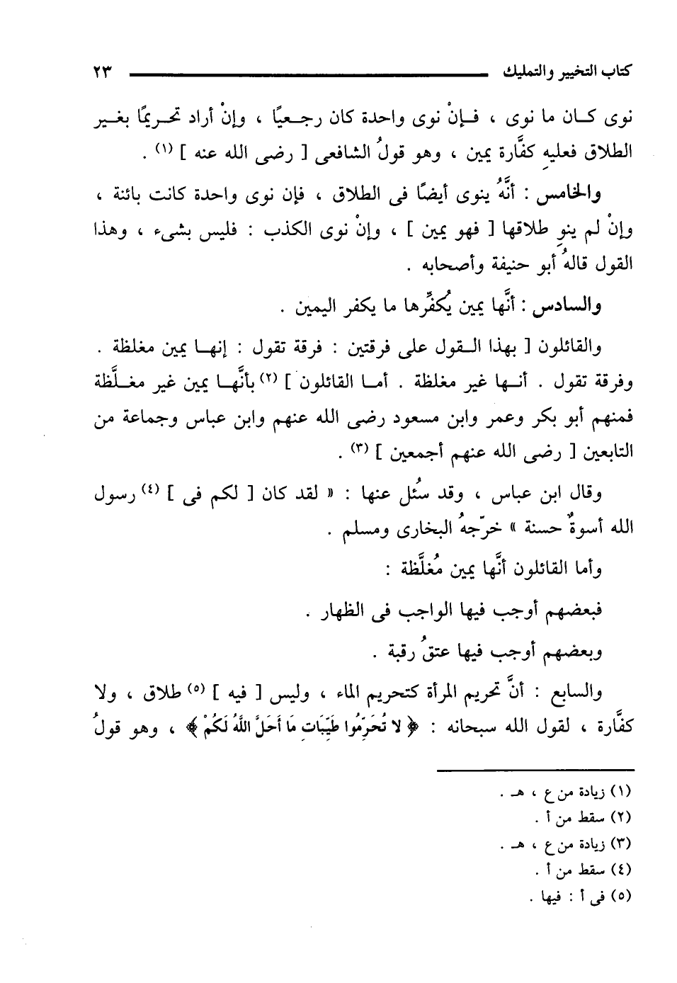 والخامس: أنَّهُ ينوى أيضًا في الطلاق، فإن نوى واحدة كانت بائنة، وإنْ لم ينوِ طلاقها [فهو يمين]، وإنْ نوى الكذب: فليس بشىء، وهذا القول قالهُ أبو حنيفة وأصحابه.