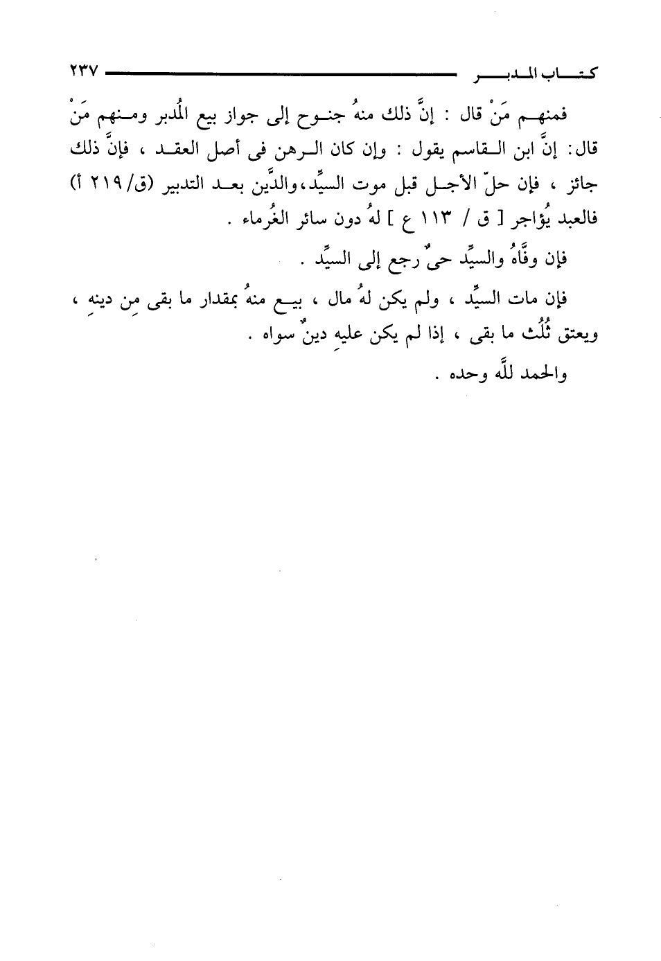 فمنهم مَنْ قال: إنَّ ذلك منهُ جنوح إلى جواز بيع المُدبر ومنهم مَنْ قال: إن ابن القاسم يقول: وإن كان الرهن في أصل العقد، فإنَّ ذلك جائز، فإن حلّ الأجل قبل موت السيِّد، والدَّين بعد التدبير فالعبد يُؤاجر لهُ دون سائر الغُرماء.
