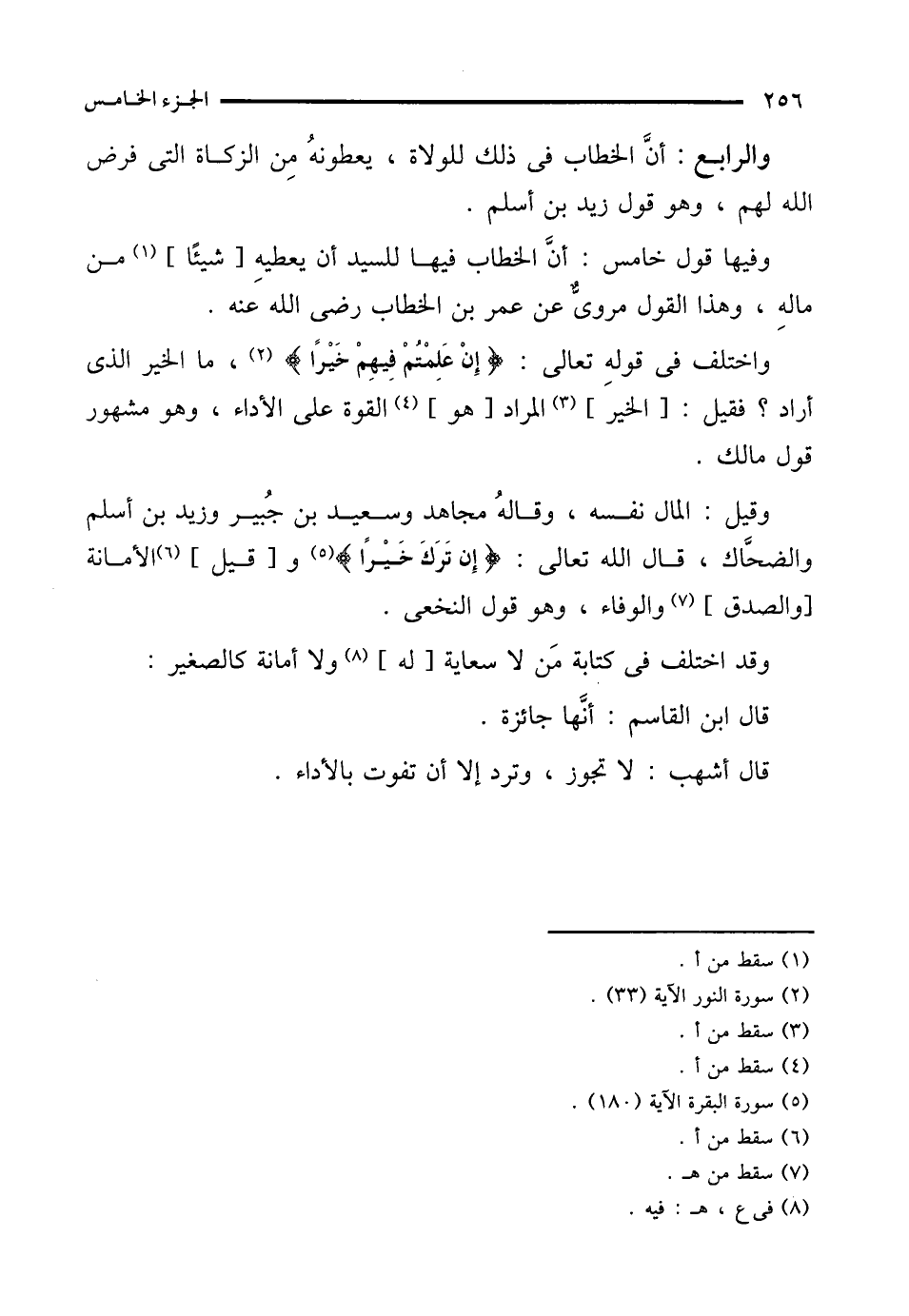وفيها قول خامس: أن الخطاب فيها للسيد أن يعطيهِ [شيئًا] (¬1) من مالهِ، وهذا القول مروىٌّ عن عمر بن الخطاب رضي الله عنه.