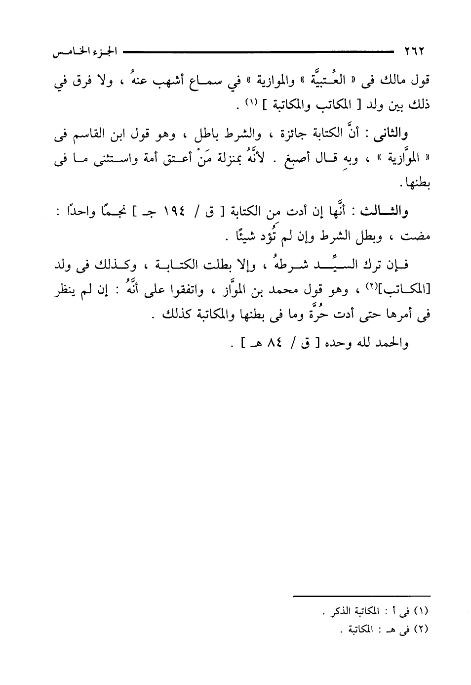 قول مالك في "العُتبيَّة" و"الموازية" في سماع أشهب عنهُ، ولا فرق في ذلك بين ولد [المكاتب والمكاتبة] (¬1).