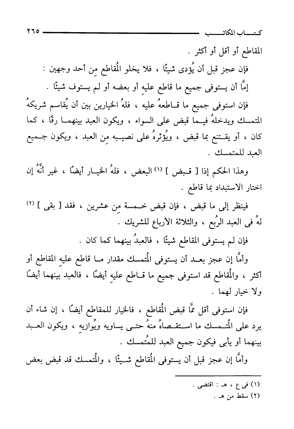 فإن استوفى أقل ممَّا قبض المُقاطع، فالخيار للمقاطع أيضًا، إن شاء أن يرد على المُتمسك ما استقصاهُ منهُ حتى يساويه ويُوازيهِ، ويكون العبد بينهما أو يأبى فيكون جميع العبد للمُتمسك.