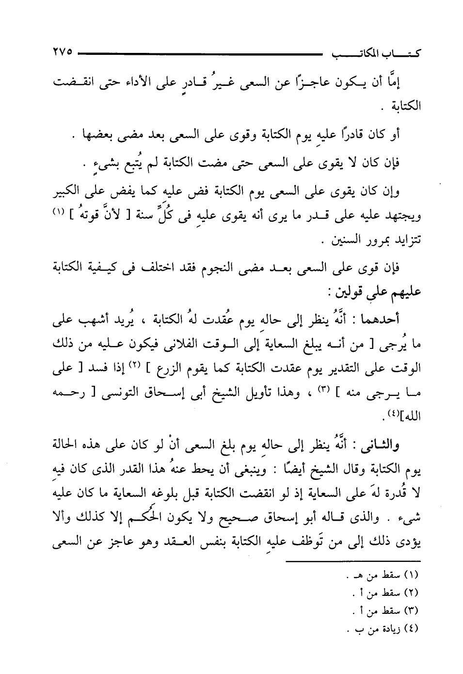 والثانى: أنَّهُ ينظر إلى حالهِ يوم بلغ السعى أنْ لو كان على هذه الحالة يوم الكتابة وقال الشيخ أيضًا: وينبغى أن يحط عنهُ هذا القدر الذي كان فيه لا قُدرة لهَ على السعاية إذ لو انقضت الكتابة قبل بلوغه السعاية ما كان عليه شىء. والذي قاله أبو إسحاق صحيح ولا يكون الحُكم إلا كذلك وألا يؤدى ذلك إلى من تَوظف عليهِ الكتابة بنفس العقد وهو عاجز عن السعى