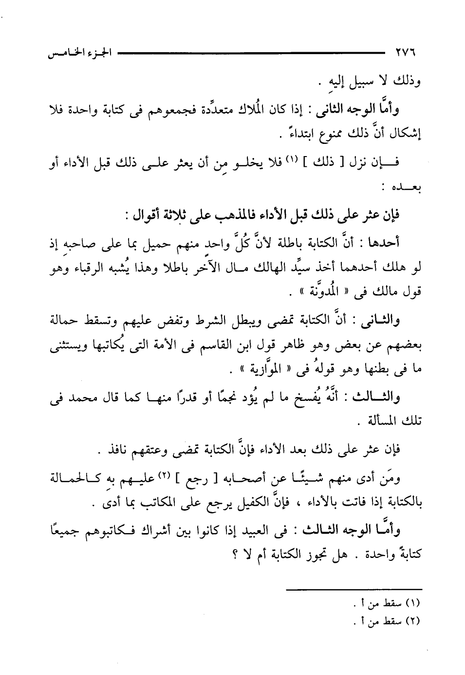 والثانى: أن الكتابة تمضى ويبطل الشرط وتفض عليهم وتسقط حمالة بعضهم عن بعض وهو ظاهر قول ابن القاسم في الأمة التي يُكاتبها ويستثنى ما في بطنها وهو قولهُ في "الموَّازية".