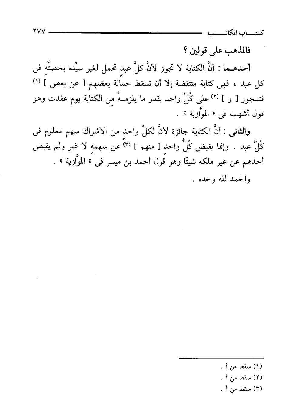 والثانى: أنَّ الكتابة جائزة لأنَّ لكلِّ واحدٍ من الأشراك سهم معلوم فى كُلِّ عبد. وإنما يقبض كُلُّ واحدٍ [منهم] (¬3) عن سهمهِ لا غير ولم يقبض أحدهم عن غير ملكه شيئًا وهو قول أحمد بن ميسر في "الموَّازية".