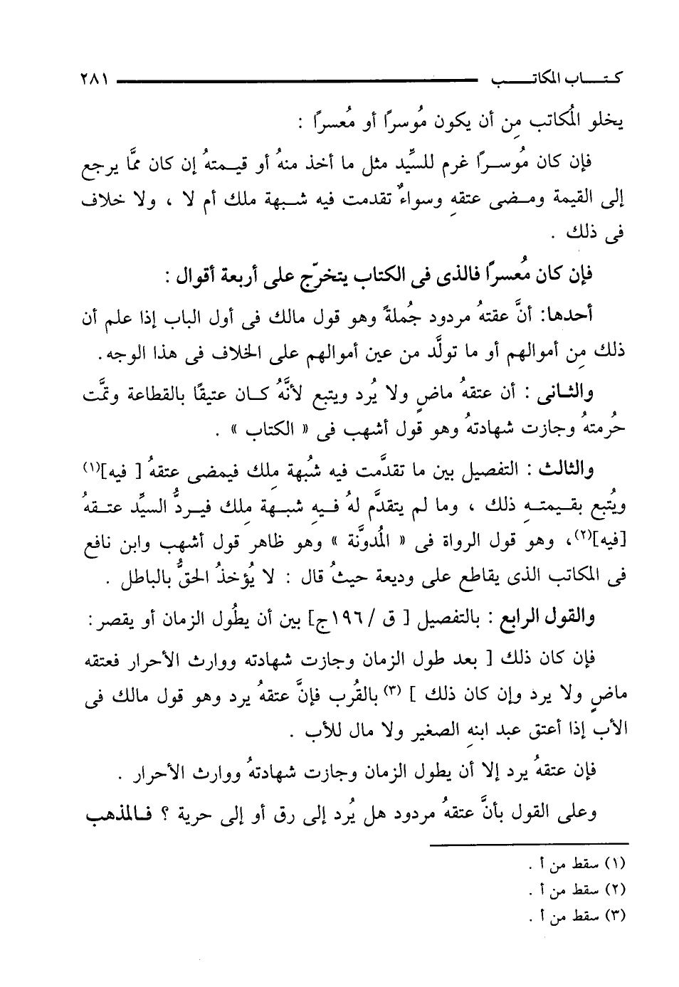 فإن كان مُعسرًا فالذي في الكتاب يتخرّج على أربعة أقوال: