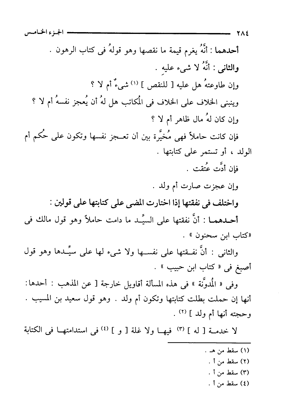 والثانى: أنَّ نفقتها على نفسها ولا شىء لها على سيِّدها وهو قول أصبغ في "كتاب ابن حبيب".