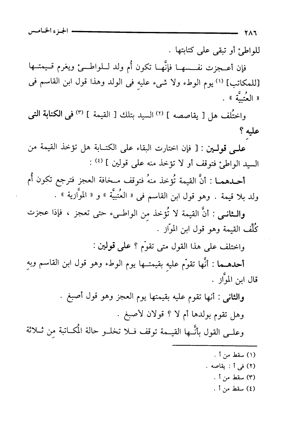 والثانى: أنَّ القيمة لا تُؤخذ مِن الواطىء حتى تعجز، فإذا عجزت كُلِّف القيمة وهو قول ابن الموّاز.