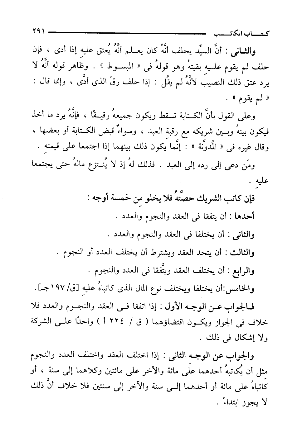 والجواب عن الوجه الثانى: إذا اختلف العقد واختلف العدد والنجوم مثل أن يُكاتبهُ أحدهما على مائة والآخر على مائتين وكلاهما إلى سنة، أو كَاتباهُ على مائة أو أحدهما إلى سنة والآخر إلى سنتين فلا خلاف أنَّ ذلك لا يجوز ابتداءً.