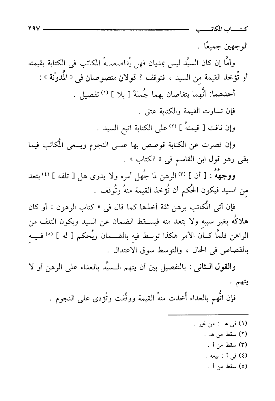 وأمَّا إن كان السيِّد ليس بمديان فهل يُقاصصهُ المكاتب في الكتابة بقيمته أو تُؤخذ القيمة مِن السيد، فتوقف؟ قولان منصوصان في "المُدوّنة":