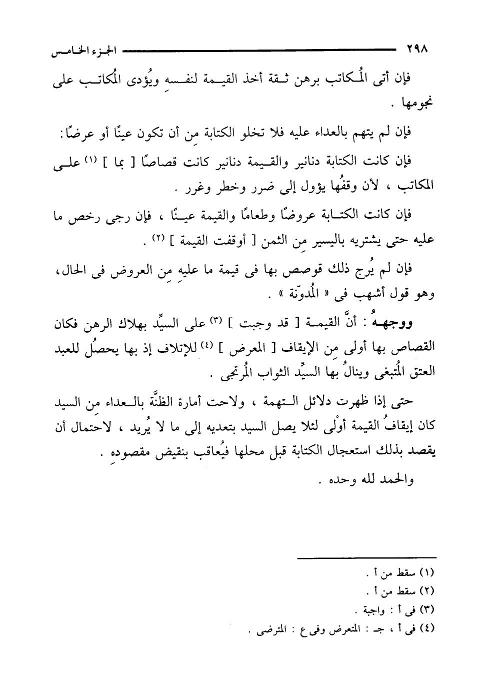 حتى إذا ظهرت دلائل التهمة، ولاحت أمارة الظنَّة بالعداء مِن السيد كان إيقافُ القيمة أوْلى لئلا يصل السيد بتعديه إلى ما لا يُريد، لاحتمال أن يقصد بذلك استعجال الكتابة قبل محلها فيُعاقب بنقيض مقصودهِ.