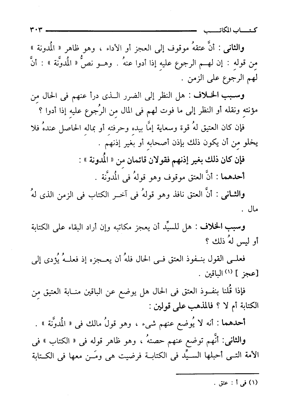 والثانى: أنَّ عتقهُ موقوف إلى العجز أو الأداء، وهو ظاهر "المُدونة" مِن قولهِ: إن لهم الرجوع عليهِ إذا أدوا عنهُ. وهو نصُّ "المُدوَّنة": أنَّ لهم الرجوع على الزمن.