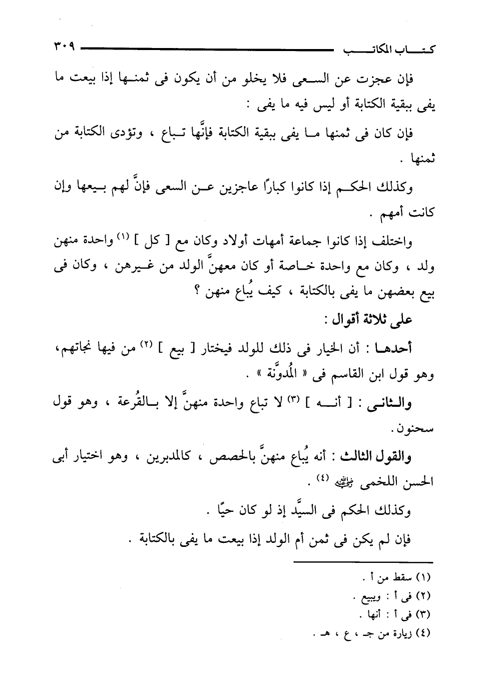 والقول الثالث: أنه يُباع منهنَّ بالحصص، كالمدبرين، وهو اختيار أبى الحسن اللخمى - رضي الله عنه - (¬4).