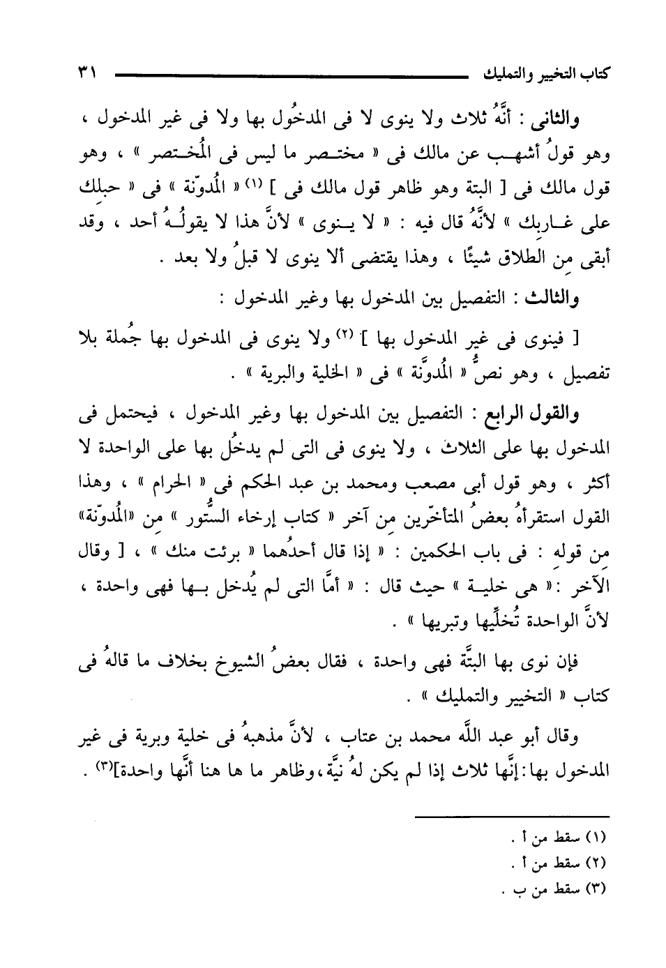 فإن نوى بها البتَّة فهي واحدة، فقال بعضُ الشيوخ بخلاف ما قالهُ في كتاب "التخيير والتمليك".