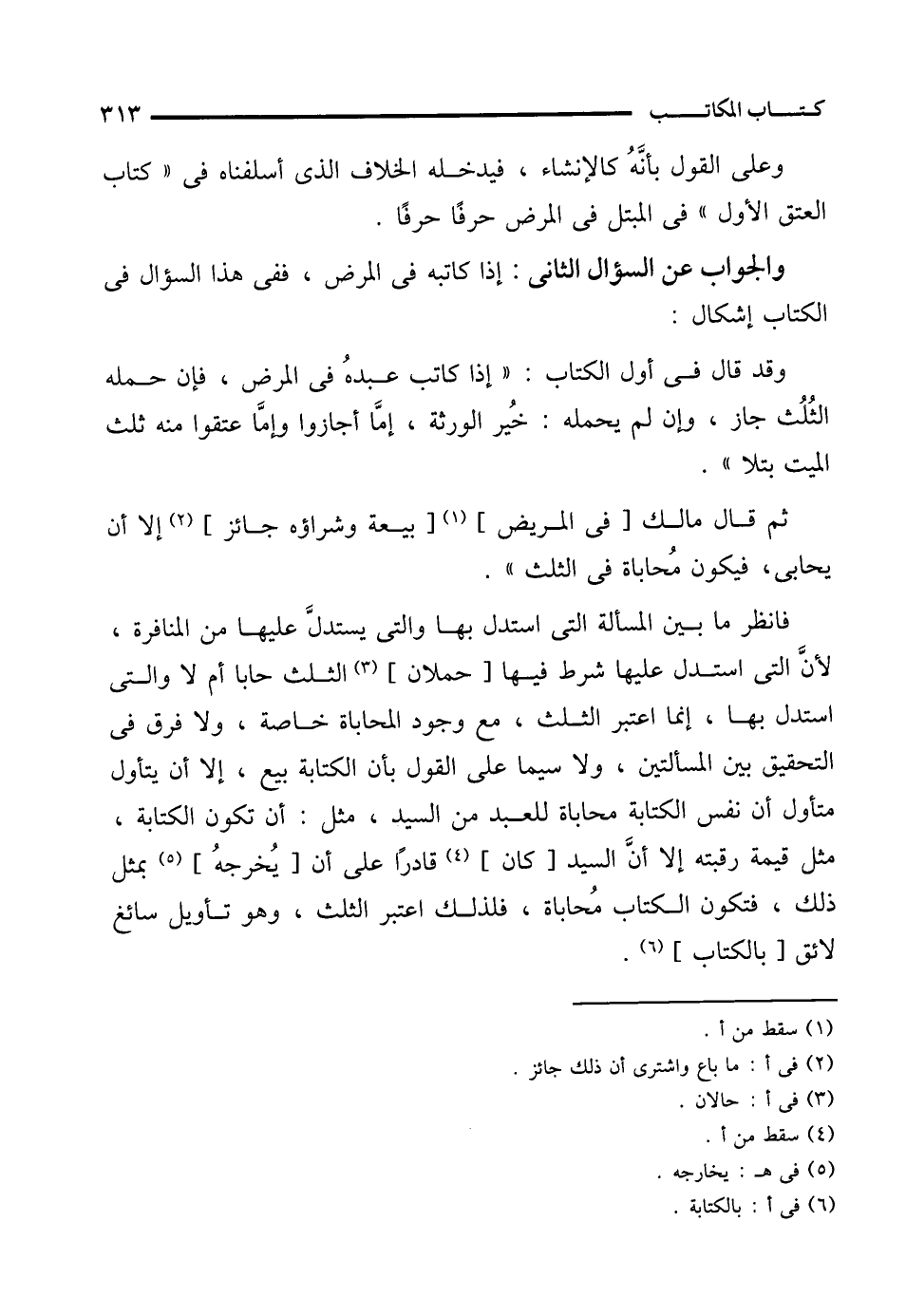 والجواب عن السؤال الثاني: إذا كاتبه فى المرض، ففى هذا السؤال فى الكتاب إشكال: