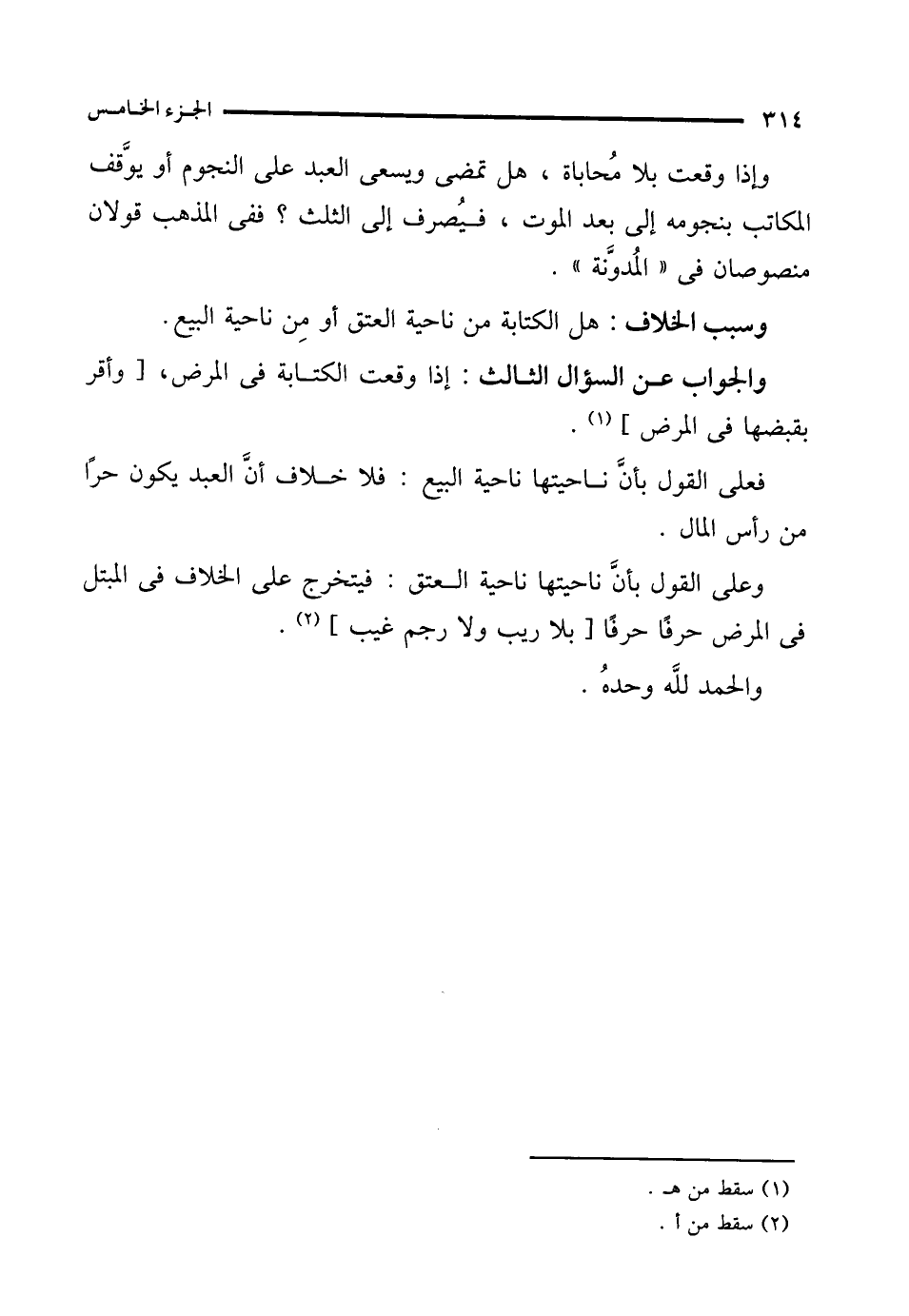 وإذا وقعت بلا مُحاباة، هل تمضى ويسعى العبد على النجوم أو يوَّقف المكاتب بنجومه إلى بعد الموت، فيُصرف إلى الثلث؟ ففى المذهب قولان منصوصان فى "المُدوَّنة".
