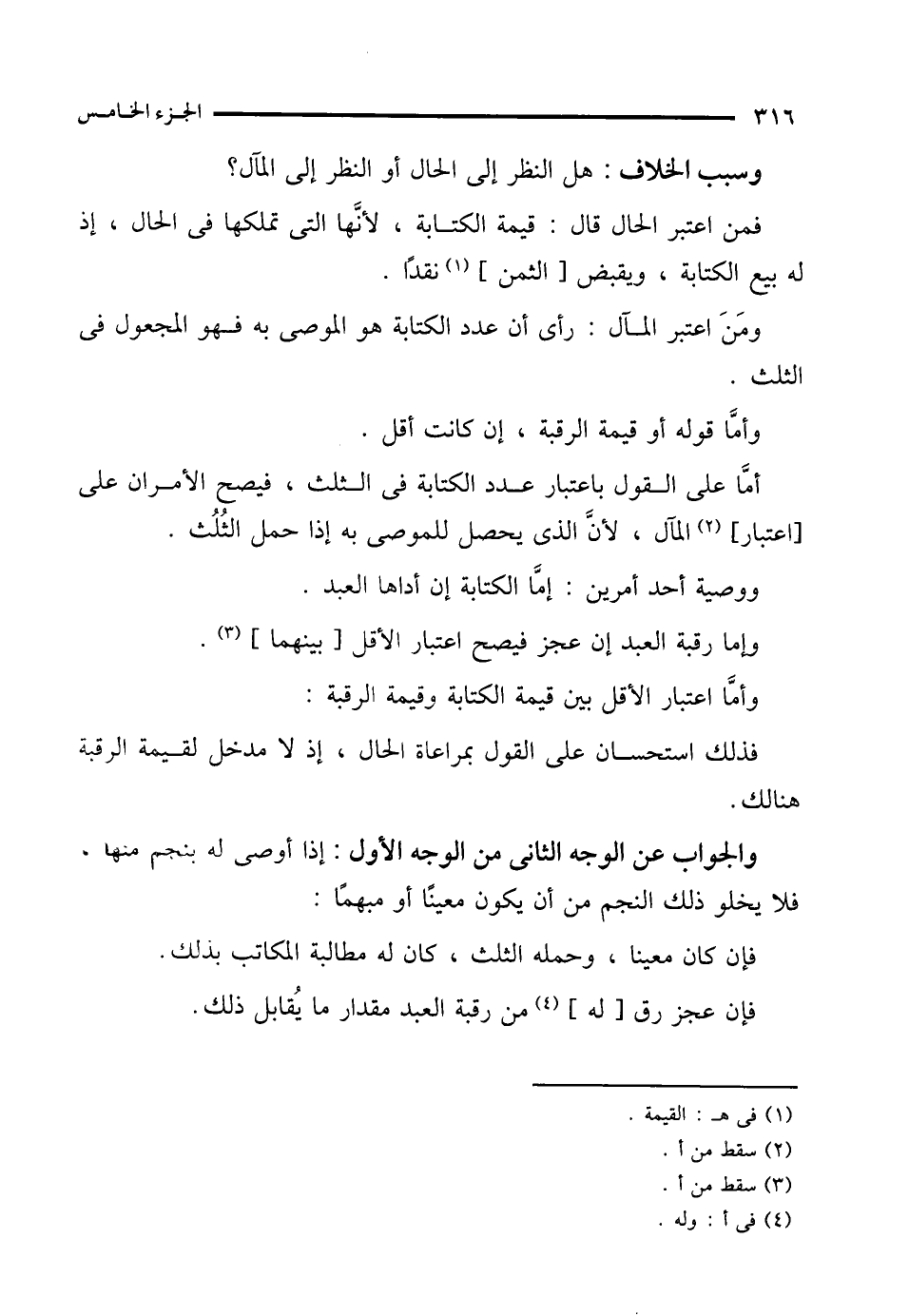 ومَنَ اعتبر المآل: رأى أن عدد الكتابة هو الموصى به فهو المجعول فى الثلث.