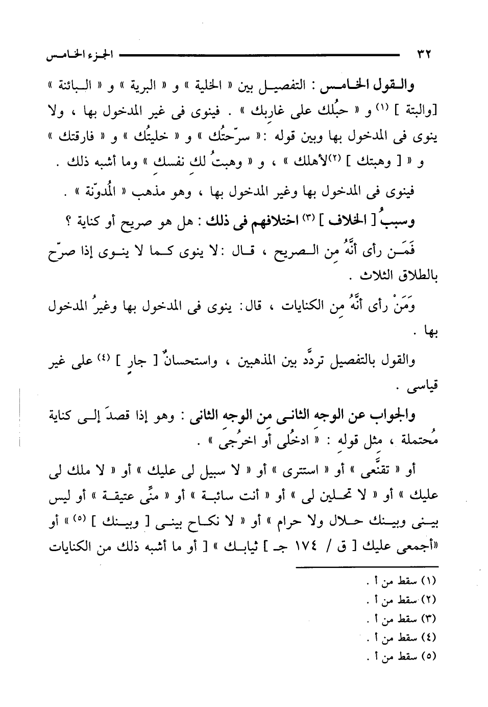 والقول الخامس: التفصيل بين "الخلية" و"البرية" و"البائنة" [والبتة] (¬1) و"حبُلك على غارِبك". فينوى في غير المدخول بها، ولا ينوى في المدخول بها وبين قوله: "سرّحتُك" و"خليتُك" و"فارقتك" و " [وهبتك] (¬2) لأهلك"، و"وهبتُ لكِ نفسكِ" وما أشبه ذلك.