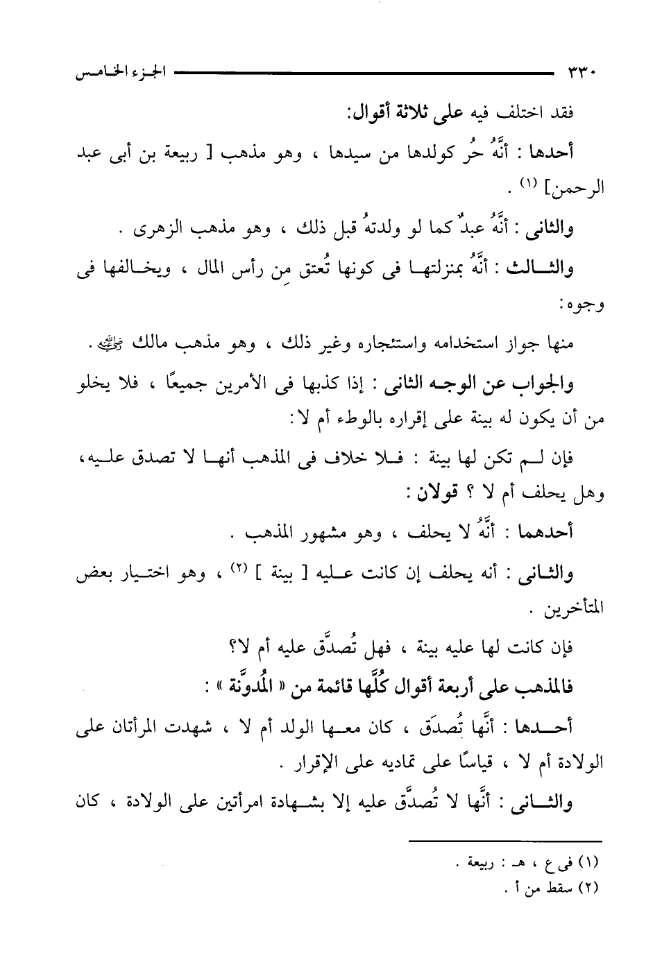أحدها: أنَّهُ حُر كولدها من سيدها، وهو مذهب [ربيعة بن أبي عبد الرحمن] (¬1).
