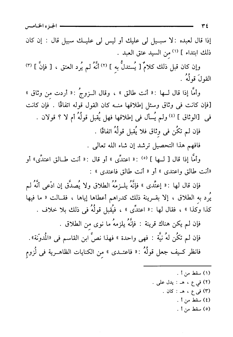 فإن قال لها: "إعتِّدى" فإنَّهُ يلزمُه الطلاق ولا يُصدَّق إن ادّعى أنَّهُ لم يُرد بهِ الطلاق، إلا بقرينة ذلك كدراهم أعطاها إياها، فقالت "ما فيها كذا وكذا"، فقال لها: "اعتدِّى"، فيُقبل قولُهُ في ذلك بلا خلاف.