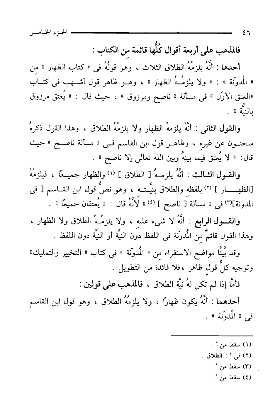 والقول الرابع: أنَّهُ لا شىء عليهِ، ولا يلزمُهُ الطلاق ولا الظهار، وهذا القول قائمٌ مِن المُدوّنة في اللفظ دون النيَّة أو النيَّة دون اللفظ.