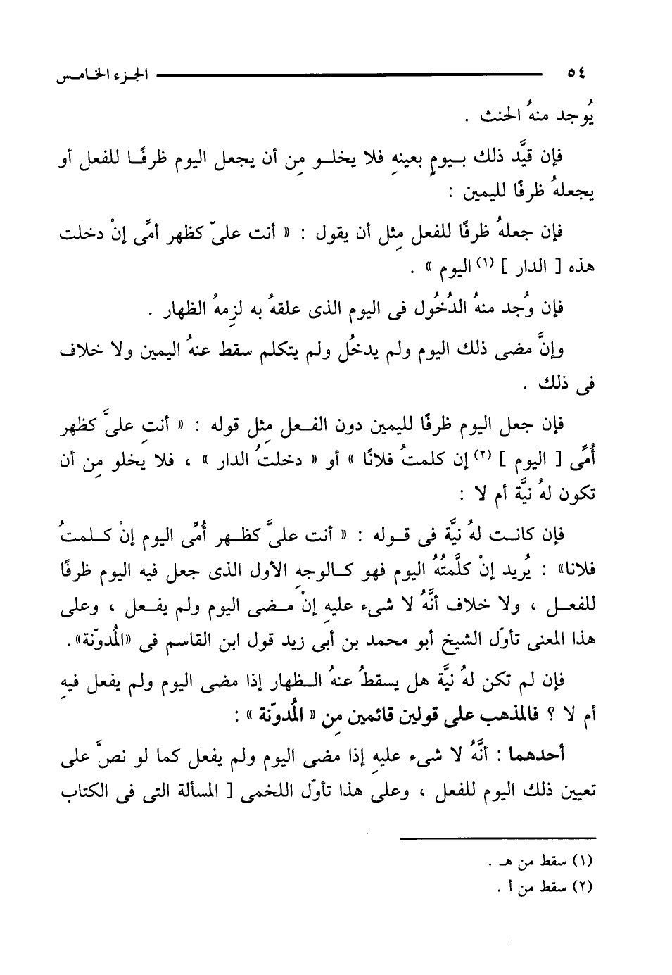 فإن كانت لهُ نيَّة في قوله: "أنت علىَّ كظهر أمِّى اليوم إنْ كلمتُ فلانا": يُريد إنْ كلَّمتُهُ اليوم فهو كالوجه الأول الذي جعل فيه اليوم ظرفًا للفعل، ولا خلاف أنَّهُ لا شىء عليهِ إنْ مضى اليوم ولم يفعل، وعلى هذا المعنى تأوّل الشيخ أبو محمَّد بن أبي زيد قول ابن القاسم في "المُدوّنة".