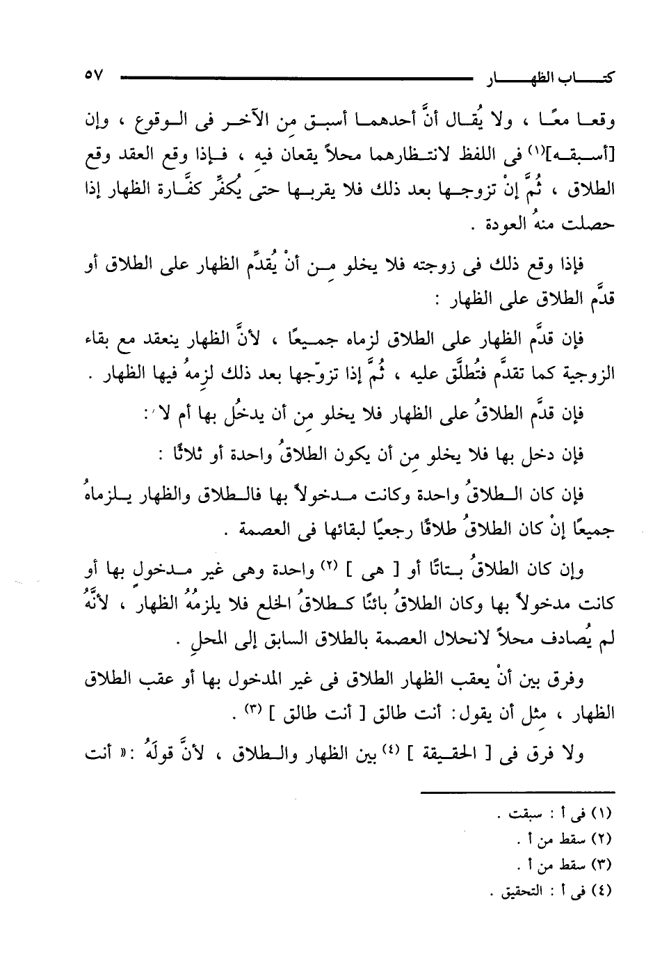 وفرق بين أنْ يعقب الظهار الطلاق في غير المدخول بها أو عقب الطلاق الظهار، مِثل أن يقول: أنت طالق [أنت طالق] (¬3).