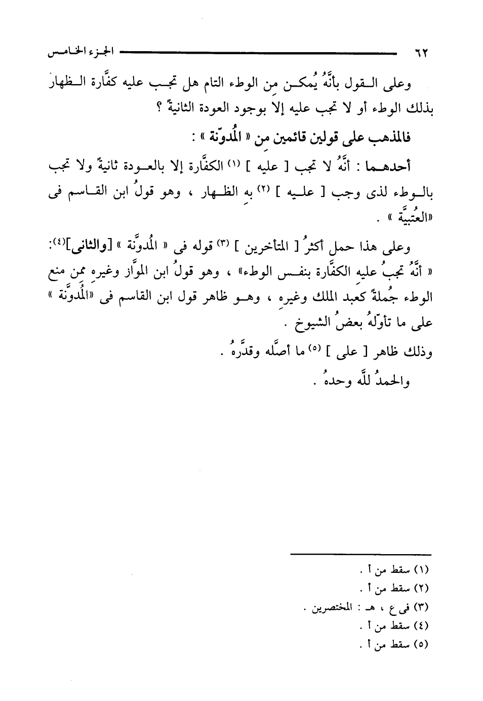وعلى هذا حمل أكثرُ [المتأخرين] (¬3) قوله في "المُدوَّنة" [والثانى] (¬4): "أنَّه تجبُ عليهِ الكفَّارة بنفس الوطء"، وهو قولُ ابن الموَّاز وغيرهِ ممن منع الوطء جُملةً كعبد الملك وغيرهِ، وهو ظاهر قول ابن القاسم في "المُدوَّنة" على ما تأوّلهُ بعضُ الشيوخ.
