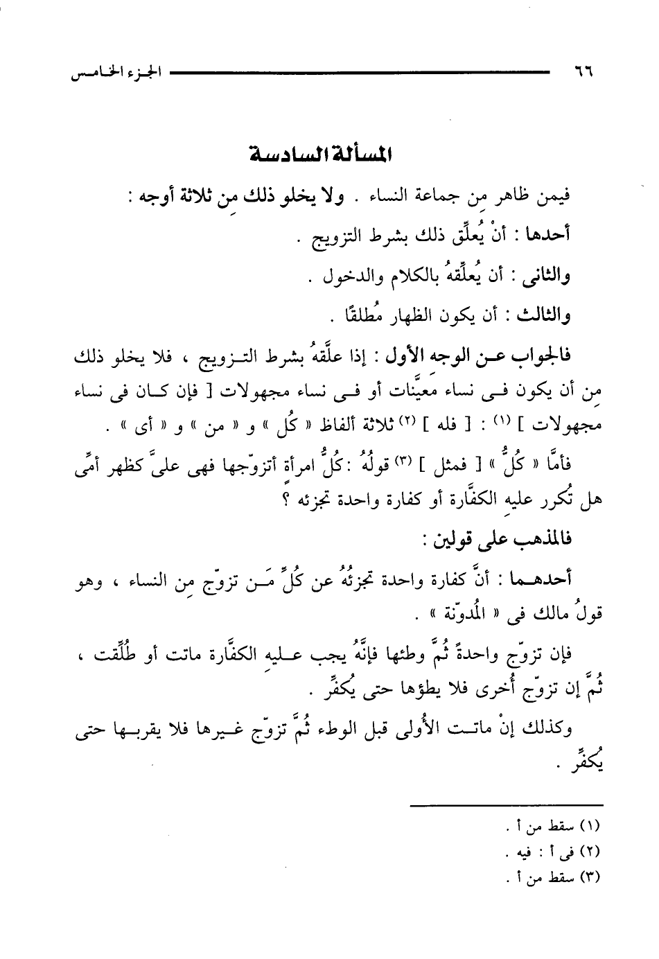 فيمن ظاهر مِن جماعة النساء. ولا يخلو ذلك مِن ثلاثة أوجه: