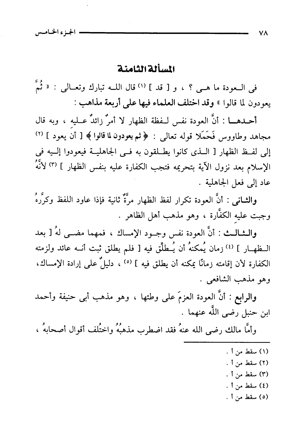 في العودة ما هى؟، و [قد] (¬1) قال الله تبارك وتعالى: {ثُمَّ يَعُودُونَ لِمَا قَالُوا} وقد اختلف العلماء فيها على أربعة مذاهب: