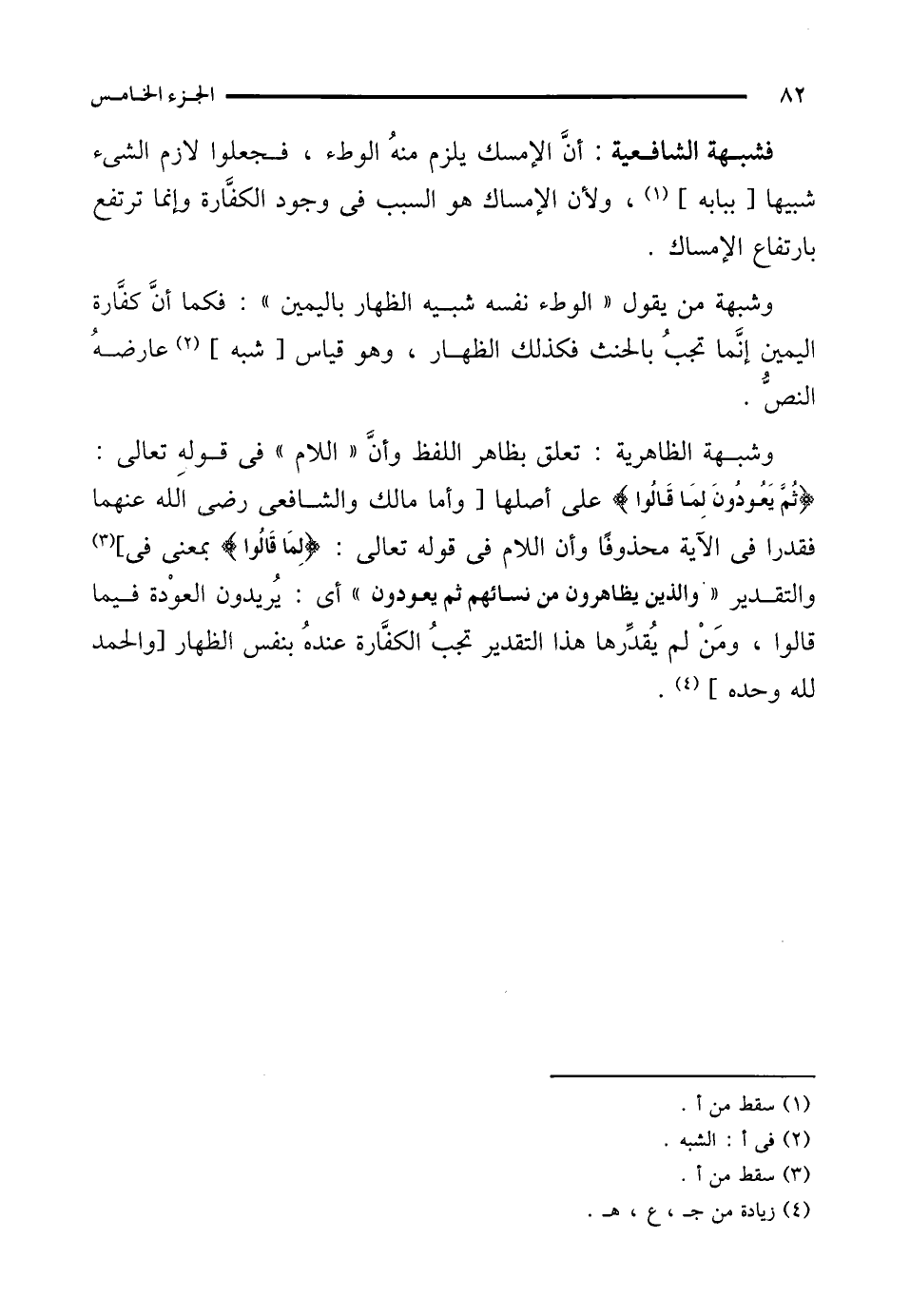 وشبهة الظاهرية: تعلق بظاهر اللفظ وأنَّ "اللام" في قوله تعالى: {ثُمَّ يَعُودُونَ لِمَا قَالُوا} على أصلها [وأما مالك والشافعى رضي الله عنهما فقدرا في الآية محذوفًا وأن اللام في قوله تعالى: {لِمَا قَالُوا} بمعنى في] (¬3) والتقدير "والذين يظاهرون من نسائهم ثم يعودون" أي: يُريدون العوْدة فيما قالوا، ومَنْ لم يُقدِّرها هذا التقدير تجبُ الكفَّارة عندهُ بنفس الظهار [والحمد لله وحده] (¬4).
