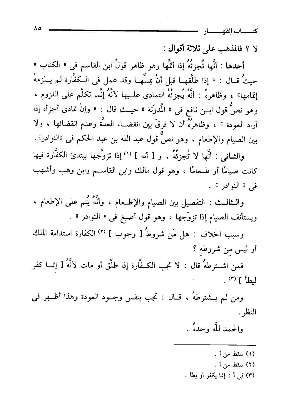 أحدها: أنَّها تُجزئُهُ إذا أتمَّها وهو ظاهر قولُ ابن القاسم في "الكتاب" حيثُ قال: "إذا طلَّقها قبل أنْ يمسَّها وقد عمل في الكفَّارة لم يلزمهُ إتمامها"، وظاهرهُ: أنَّهُ يُجزئُهُ التمادى عليها لأنَّهُ إنَّما تكلَّم على اللزوم، وهو نصُّ قول ابن نافع في "المُدوّنة" حيث قال: "وإن تمادى أجزأه إذا أراد العودة"، وظاهرُهُ أن لا فرقَ بين انقضاء العدَّة وعدم انقضائها، ولا بين الصيام والإطعام، وهو نصُّ قول عبد الله بن عبد الحكم في "النوادر".