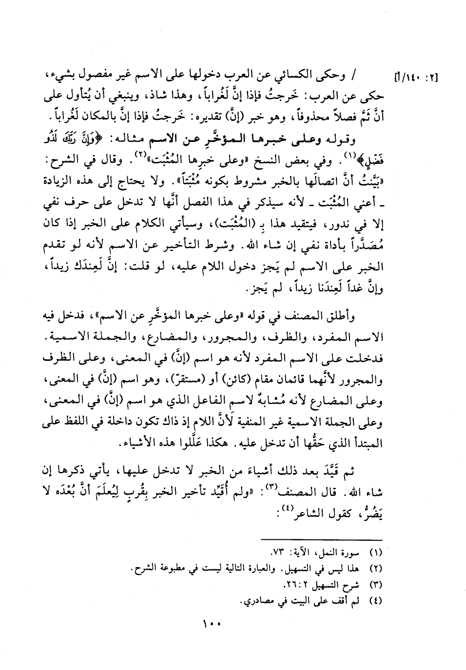 وقوله وعلى خبرها المؤخر عن الاسم مثاله: {وَإِنَّ رَبَّكَ لَذُو فَضْلٍ} وفي بعض النسخ" وعلى خبرها المثبت". وقال في الشرح: " بينت أن اتصالها بالخبر مشروط بكونه مثبتا" ولا يحتاج إلى هذه الزيادة-أعني المثبت- لأنه سيذكر في هذا الفصل أنها لا تدخل على حرف نفي إلا في ندور , فيتقيد هذا بـ (المثبت) وسيأتي الكلام على الخبر إذا كان مصدراً بأداة نفي إن شاء الله. وشرط التأخير عن الاسم لأنه لو تقدم الخبر على الاسم لم يجز دخول اللام عليه, ولو قلت: إن لعندك زيداً وإن زيدا وإن غدا لعندنا زيداً لم يجز.