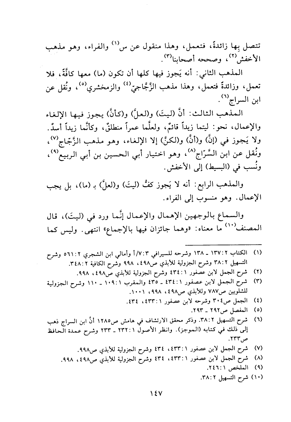 المذهب الثاني: أنه يجوز فيها كلها أن تكون (ما) معها كافة, فلا تعمل, وزائدة فتعمل, وهذا مذهب الزجاجي والزمخشري, ونقل عن ابن السراج.