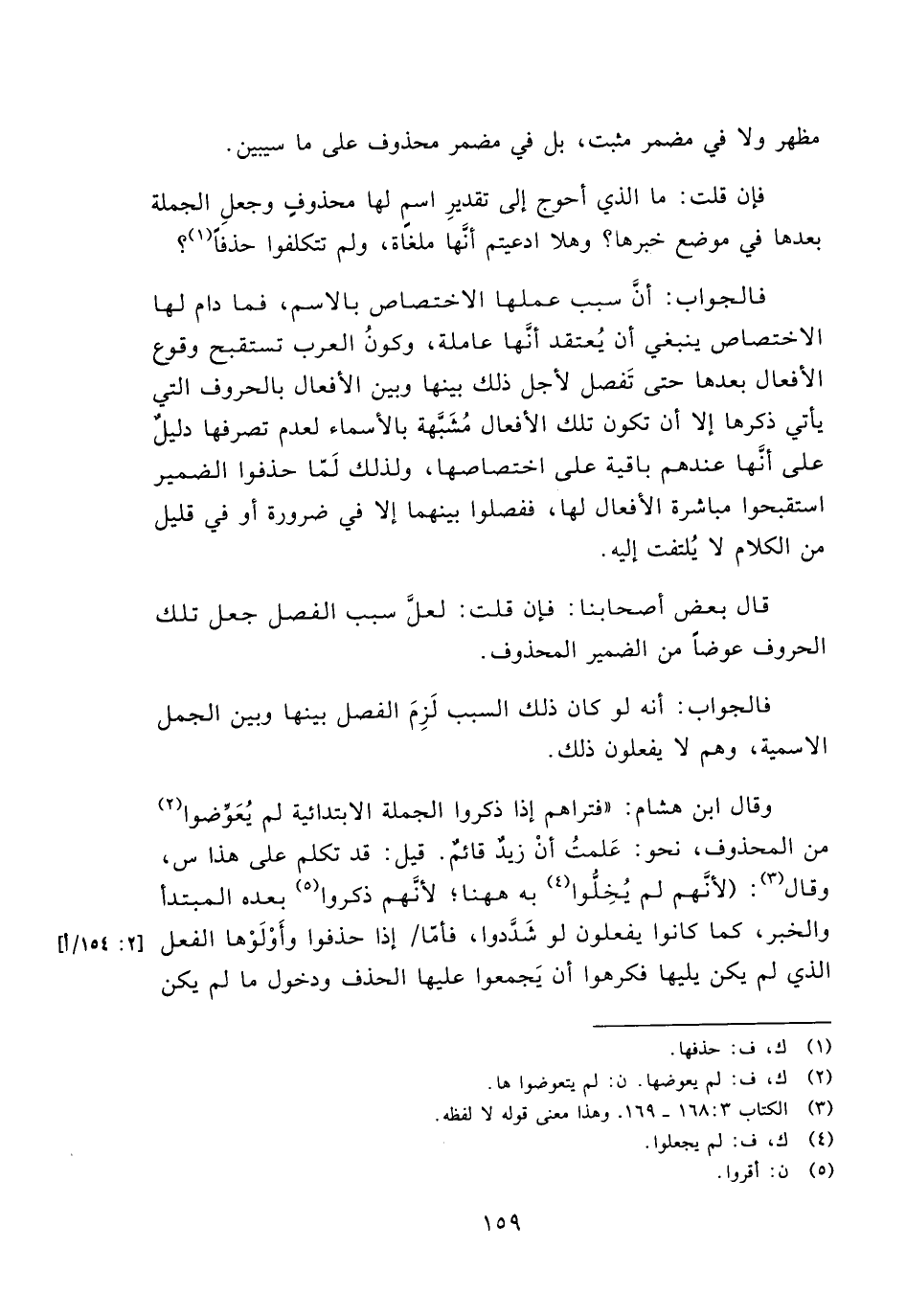 وقال ابن هشام: ((فتراهم إذا ذكروا الجملة الابتدائية لم يعوضوا من المحذوف, نحو: علمت أن زيد قائم. قيل: قد تكلم علي هذا س, وقال: (لأنهم لم يخلوا به ههنا؛ لأنهم ذكروا بعده المبتدأ والخبر, كما كانوا يفعلون لو شددوا, فأما/ إذا حذفوا وأولها الفعل الذي لم يكن يليها فكرهوا أن يجمعوا عليها الحذف ودخول ما لم يكن