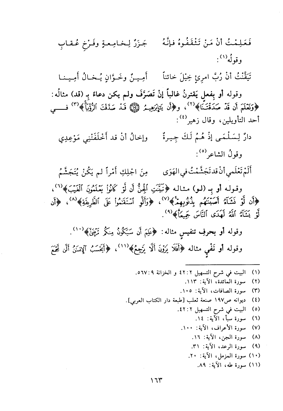 وقوله أو بحرف تنفيس مثاله:} عَلِمَ أَن سَيَكُونُ مِنكُم مَّرْضَى} وقوله أو نفي مثاله} أَفَلا يَرَوْنَ أَلاَّ يَرْجِعُ {,} أَيَحْسَبُ الْإِنسَانُ أَلَّن نَجْمَعَ