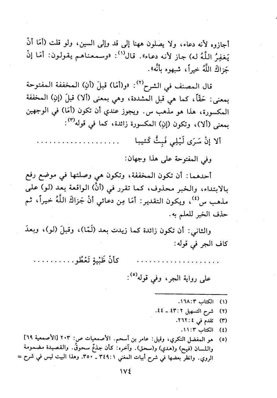 أجازوه لأنه دعاء, ولا يصلون ههنا إلى قد وإلى السين, ولو قلت (أما أن يغفر الله له) جاز لأنه دعاء", قال: "وسمعناهم يقولون: أما إن جزاك الله خيرًا, شبهوه بأنه".