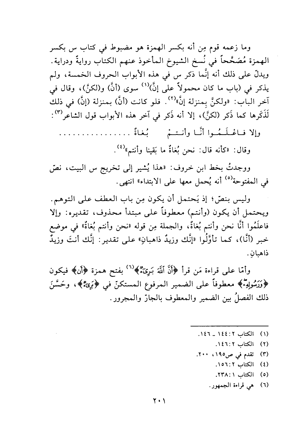 وما زعمه قوم من أنه كسر الهمزة هو مضبوط في كتاب س بكسر الهمزة مصححًا في نسخ الشيوخ المأخوذ عنهم الكتاب رواية ودراية. ويدل على ذلك أنه إنما ذكر س في هذه الأبواب الحروف الخمسة، ولم يذكر في (باب ما كان محمولًا على إن) سوى (أن) و (لكن)، وقال في آخر الباب: "ولكن منزله إن". فلو كانت (أن) بمنزله (إن) في ذلك لذكرهما كما ذكر (لكن)، إلا أنه ذكر في آخر هذه الأبواب قول الشاعر: