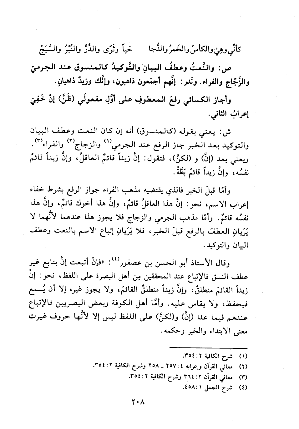 ش: يعني بقوله (كالمنسوق) أنه إن كان النعت وعطف البيان والتوكيد بعد الخبر جاز الرفع عند الجرمي والزجاج والفراء ويعني بعد (إن) و (لكن)، فتقول: إن زيدًا قائم العاقل، وإن زيدًا قائم نفسه، وإن زيدًا قائم بطنه.